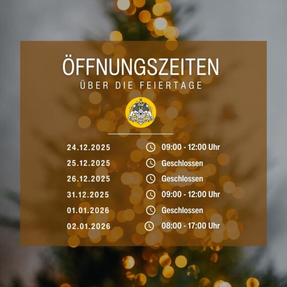 Achtung! Bitte beachten: Am Freitag, den 12.12.2025 schließen wir ausnahmsweise schon um 16:00 Uhr, da unsere Team-Weihnachtsfeier ansteht!