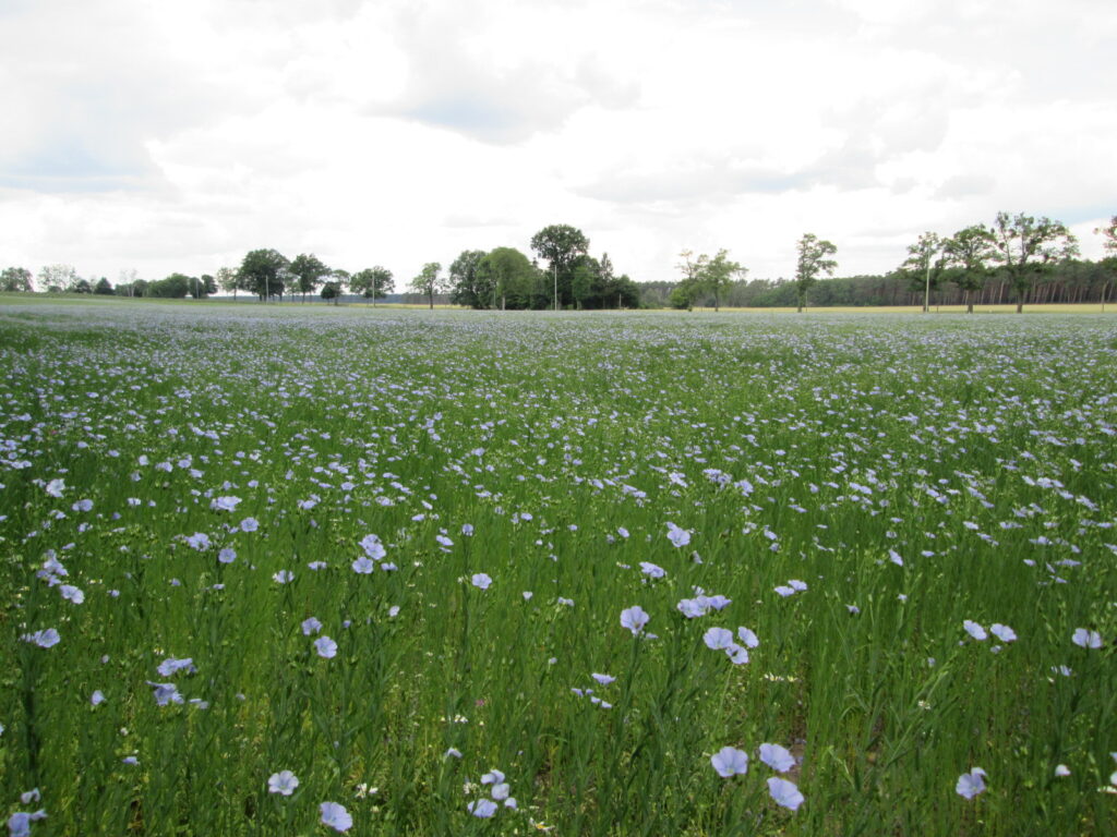 Der Leinsamen für unser kostbares Spreewälder Leinöl zeigt sich derzeit von seiner besten Seite: kräftig, gesund und voller Wachstumskraft. Noch braucht es etwas Geduld – doch voraussichtlich Ende August bis Anfang September können wir die diesjährige Ernte einfahren. Damit ist garantiert: Ihr frisches Leinöl aus regional angebautem Leinsamen ist auch im kommenden Jahr gesichert. Bis dahin arbeiten wir noch mit den sorgfältig gelagerten Vorräten der letzten Ernte. Wir haben für Sie schon einmal einen Blick auf die nahgelegenen Felder geworfen – und natürlich auch ein aktuelles Foto mitgebracht. So können Sie sehen, wie prächtig der Leinsamen in unserer Nachbarschaft gedeiht. Wir freuen uns schon auf die Ernte – und auf viele neue Pressungen frischen Leinöls!